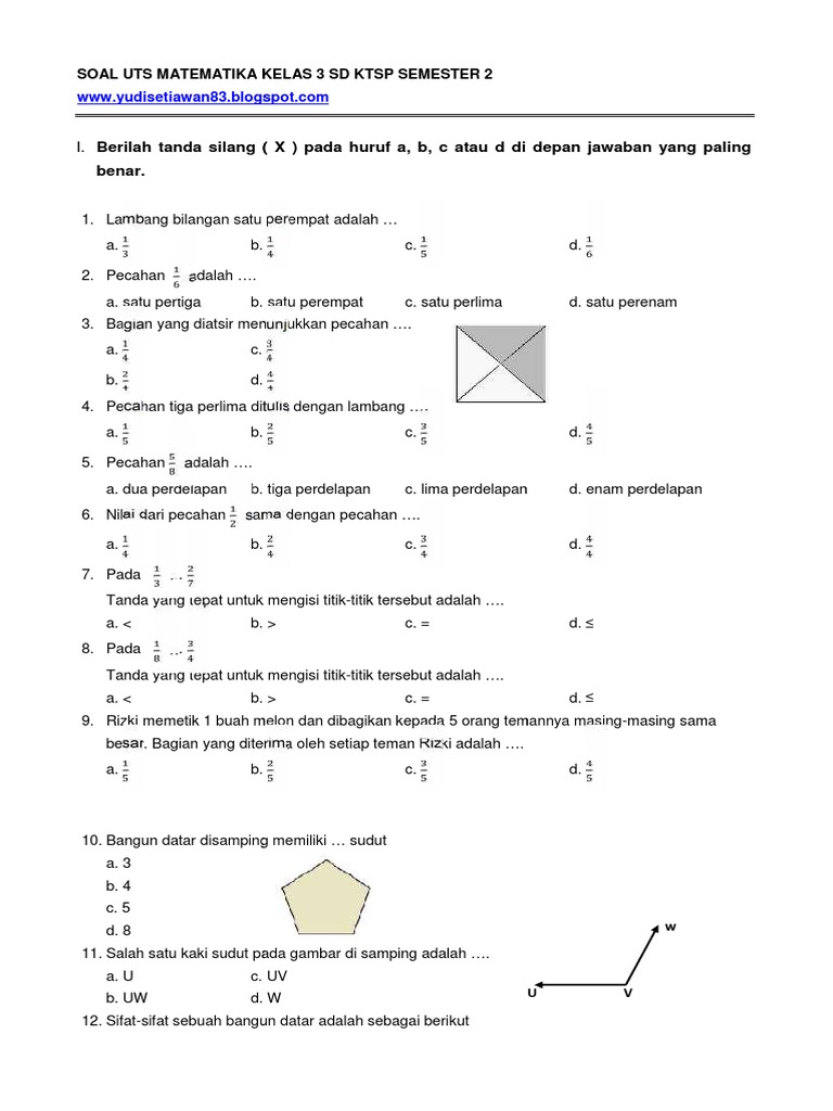 Apr 1, 2021 — kumpulan soal matematika kelas 8 semester 1 dan jawabannya kumpulan soal matematika kelas 5 semester 2 kurikulum 2013 download aug 09,. Lalu tuliskanlah nilai pecahan dari bagian yang diarsir! Yang sangat cocok digunakan sebagai bahan belajar saat ini. Jumlah soal pilihan ganda 25 jumlah soal isian singkat 10 jumlah soal uraian 5 contoh contoh soal di dalamnya. Membaca data kelas 4 sd.